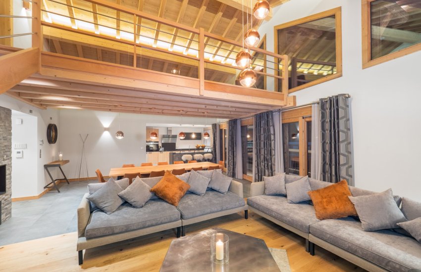 The layout of the apartment has a large open plan living room, kitchen and dining area on the main floor, with generous proportions and a sleek, modern feel. 3 of the guest bedrooms are on this level, all ensuite with zip lock beds allowing you to choose a double or twin setup. One of the rooms has bunk beds in a separate 'coin montagne' area.