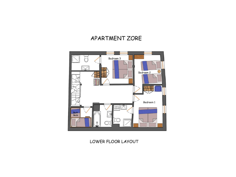 You enter Apartment Zore and climb the stairs to the bedroom floor with 3 rooms, a 'coin montagne' and a family bathroom with a washing machine. All the main bedrooms have zip locks beds for great versatility, the coin montagne is a cosy box room that has two of the properties eight single beds cleverly installed to give room for two adults, though you should be thoughtful of the who will use the room when booking as the beds are small.