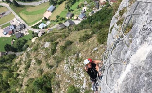 A Via Ferrata is best described as mix of rock climbing and walking, you rope in and scale precarious ledges and drops, with use of climbing frames and ladders. It may not be the Hilary Step but it's high and it feels it every step of the way.